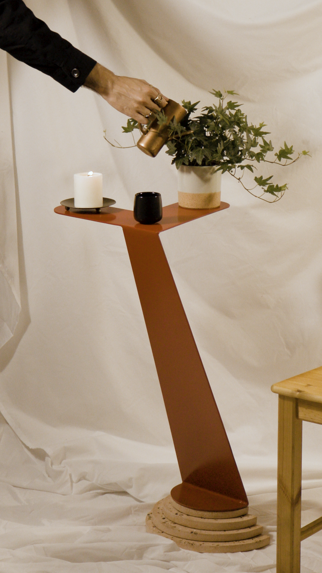 Cada mesa es fabricada a mano con atención al detalle, integrando escalones en terrazzo, cuello y base soldados en metal de 3/16" de grosor, y un tope de metal de 1/8".